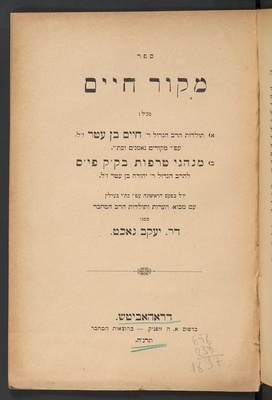 Sefer Meḳor Ḥayim : mekhil : 1) toldot ... Ḥayim Ben ʻAṭar ... :2) minhage ṭerefot be ḳehilah ḳedoshah Fes / Dr. Yaʻaḳov Nakhṭ