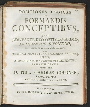 Positiones Logicae De Formandis Conceptibvs : Quas, Adivvante Deo Optimo Maximo, In Gymnasio Bipontino, D. Mens. Sept. 1745 / Quo Discipvli Profectvvm Specimina Exhibere Solent, A Commilitonvm Qvorvndam Obiectionibvs, Exercitii Gratia, Defendet Io. Phil. Carolvs Goldner, Bipontinvs Artivm Liberalivm Cvltor