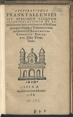 LVCVBRATIONES || FRANKTALLENSES || SEV SPECIMEN ALIQVOD || INTERPRETATIONVM ET EX-||positionum quas plurimas in difficillima || quaeque vtriusque Testamenti loca || meditatus est BONAVENTURA || CORNELIVS BERTRA-||MVS Picto Thoar-||sensis.||