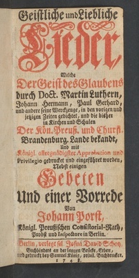 Geistliche und Liebliche Lieder, Welche Der Geist des Glaubens durch Doct. Martin Luthern, Johann Hermann, Paul Gerhard, und andere seine Werckzeuge, in den vorigen und jetzigen Zeiten gedichtet, und die bisher in Kirchen und Schulen Der Königl. Preuß. und Churfl. Brandenburg. Lande bekandt, ... Nebst einigen Gebeten und einer Vorrede / Von Johann Porst, Königl. Preußischen Consistorial-Rath, Probst und Inspectore in Berlin