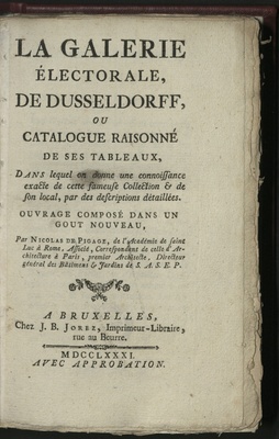 La Galerie Électorale, De Dusseldorff, Ou Catalogue Raisonné De Ses Tableaux : Dans lequel on donne une connoissance exacte de cette fameuse Collection & de son local, par des descriptions détaillées ; Ouvrage Composé Dans Un Gout Nouveau / par Nicolas de Pigage ...