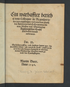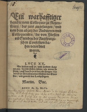 Ein warhaffter berichte vom Colloquio zu Regenspurg, dis jars angefangen und von dem abzug der Auditoren und Colloquenten die von Fürsten und Stenden der Augspurgischen Confession dahin verordnet waren / Martin Bucer
