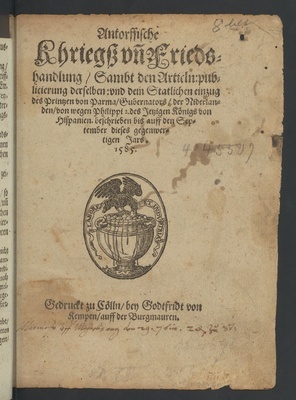 Antorffische || Khriegß vn[d] Frieds=||handlung/ Sambt den Articln: pub=||licierung derselben: vnd dem Statlichen einzug || des Printzen von Parma/ Gubernators/ der Niderlan=||den/ von wegen Philippi des 2. des Jetzigen Königs von || Hispanien, beschrieben biß auff den Sep=||tember dieses gegenwer=||tigen Jars.|| 1585.||