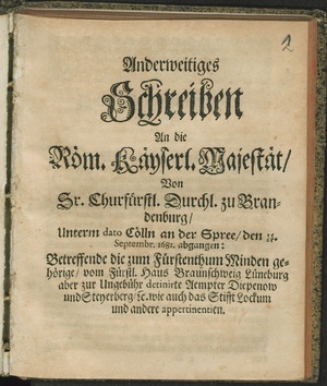 Anderweitiges Schreiben An die Röm. Käyserl. Majestät/ Von Sr. Churfürstl. Durchl. zu Brandenburg/ Unterm dato Cölln an der Spree/ den 15/25. Septembr. 1681. abgangen : Betreffende die zum Fürstenthum Minden gehörige/ vom Fürstl. Haus Braunschweig Lüneburg aber zur Ungebühr detinirte Aempter Diepenow und Steyerberg/ [et]c. wie auch das Stifft Lockum und andere appertinentien