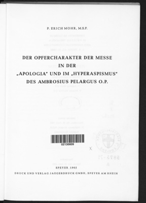 Der Opfercharakter der Messe in der 'Apologia' und im 'Hyperaspismus' des Ambrosius Pelargus O. P / Erich Mohr