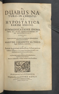 De duabus naturis in Christo : de hypostatica earum unione ; de communicatione idiomatum, et aliis quaestionibus inde dependentibus libellus / Ex Scripturae sententiis, & ex purioris antiquitatis testimoniis summo studio, & mira dexteritate Martini Chemnitii ... contextus, Ac Iterum in gratiam orthodoxae & hoc periculosissimo tempore syn theō contra haeresium monstra constanter militantis Ecclesiae, correctius editus ...