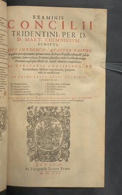 Examinis Concilii Tridentini, opus integrum, quatuor partes in quibus praecipuorum capitum totius doctrinae Papistica, firma & solida refutatio, tum ex sacrae Scripturae fontibus, tum ex orthodoxorum Patrum consensu, collecta est uno Volumine complectens. Ad Veritatis Christianae, et Antichristiane falsitatis cognitionem, perquam utile & necessarium / per D.D. Mart. Chemnicium scripti