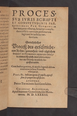 Processvs Ivris Scripti Et Consvetvdinis Frequentioris Per Germaniam hoc tempore vsitatus, breuiter complectens officia omnium personarum legitimè in iudicio versantium : = Gerichtlicher Proceß des geschriebenen Rechts, gewonheit, vnd täglichen brauchs, in Germanien jetziger zeit üblich, darinnen kürtzlich eines jeden ampt, der im Gericht wandelt, begriffen wirdt / Avctore Petro Termineo Iurisconsulto