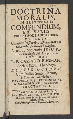 Doctrina moralis : in brevissimum compendium, ex variis probatisque auctoribus redacta: omnibus pastoribus, & animarum curatoribus facillima, & utilissi̤ma, a tribus Societatis Jesu Patribus Theologis visa & approbata / Authore R. P. Casparo Biesman Societ. Jesu Theologo.