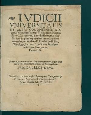 Ivdicii Vniversitatis Et Cleri Coloniensis, Aduersus calumnias Philippi Melanthonis, Martini Buceri, Oldendorpij, & eoru[m] asseclarum, defensio : cum diligenti explicatione materiarum controuersarum / Authore F. Euerhardo Billick, Theologo, fratrum Carmelitici instituti, per inferiorem Germaniam Prouinciali