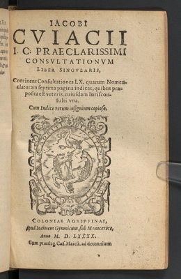 Iacobi Cviacii Consvltationvm Liber Singularis : Continens Consultationes LX. quarum Nomenclaturam septima pagina indicat, quibus praeposita est veteris, cuiusdam Iurisconsulti vna