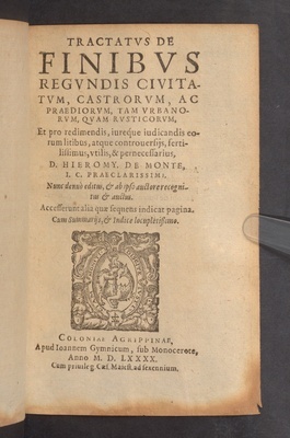 Tractatvs De Finibvs Regvndis Civitatvm, Castrorvm, Ac Praediorvm, Tam Vrbanorvm, Qvam Rvsticorvm : Et pro redimendis, iureque iudicandis eorum litibus, atque controuersis, fertilissimus, vtilis & pernecessarius / D. Hieromy. De Monte, I.C. Praeclarissimi. Nunc denuò editus, & ab ipso auctore recognitus & auctus