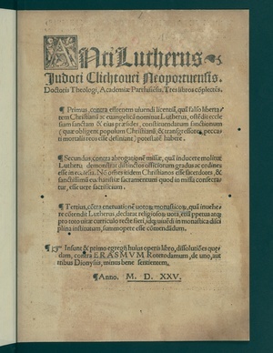 AntiLutherus Judoci Clichtovei Neoportuensis, Doctoris Theologi Academiae Parrhisie[n]sis : Tres libros co[m]plecte[n]s; Primus, contra effrenem vivendi licentia[m] ..., Secundus, contra abrogatione[m] missae ..., Tertius, co[n]tra enervatione[m] votor[um] monasticor[um] ...; Insunt ... dissolutio[n]es qu[a]edam contra Erasmum Roterodamum, de uno, aut tribus Dionysiis, minus bene sentientem