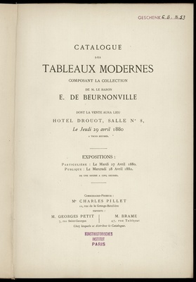 Catalogue des tableaux modernes composant la collection de M. le baron E. de Beurnonville, dont la vente aura lieu Hotel Drouot le jeudi 29 avril 1880 / commissaire-priseur Charles Pillet ...