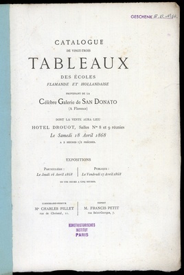 Catalogue de vingt-trois tableaux des Ècoles flamande et hollandaise : provenant de la Célèbre Galerie San Donato (à Florence) : dont la vente aura lieu Hôtel Drouot, Salles Nos 8 et 9 réunies le samedi 18 avril 1868 / commissaire-priseur: Charles Pillet ; expert Francis Petit