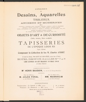 Catalogue de dessins, aquarelles, tableaux anciens et modernes par Augustin, N. Berghem, Bosio ... , objets d'art et de curiosité..., tapisseries de l'époque Louis XII, tapis d'Orient composant la collection de feu M. Charles André : vente ... à Paris, Hotel Drouot les lundi 18 et mardi 19 Mai 1914, commissaire-priseur Henri Baudoin