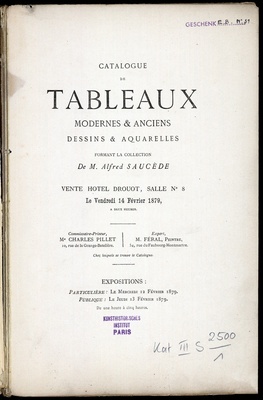 Catalogue de tableaux modernes et anciens, dessins et aquarelles formant la collection de M. Alfred Saucède : vente Hôtel Drouot le vendredi 14 février 1879 / commissaire-priseur Charles Pillet ...