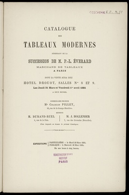 Catalogue des tableaux modernes dépendant de la succession de M. P.-L. Everard, marchand de tableaux à Paris dont la vente aura lieu Hotel Drouot les jeudi 31 mars et vendredi 1er Avril 1881 / commissaire-priseur Charles Pillet ...