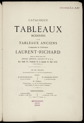 Catalogue de tableaux modernes et de tableaux anciens composant la collection Laurent-Richard, dont la vente aura lieu Hôtel Drouot les jeudi 23, vendredi 24 samedi 25 mai 1878 / commissaire-priseur Ch. Pillet ...
