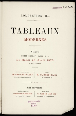 Tableaux modernes : collection H... ; vente Hôtel Drouot, salle 8, 20 avril 1875 / commissaire-priseur, Me Charles Pillet ...