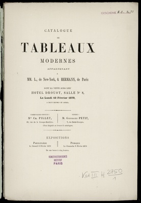 Catalogue de tableaux modernes appartenant à MM. L., de New-York, & Hermann, de Paris, dont la vente aura lieu Hotel Drouot, le lundi 10 février 1879 / commissaire-priseur Ch. PIllet ...