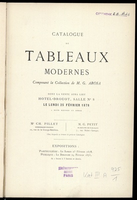 Catalogue des tableaux modernes composant la collection de M. G. Arosa : dont la vente aura lieu Hotel Drouot, le lundi 25 février 1878 / [introduction par Ph. Burty]. Commissaire-priseur Ch. Pillet