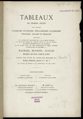 Tableaux de premier ordre des écoles italienne, flamande, hollandaise, allemande, espagnole, anglaise et française, provenant des galeries et collections de S. M. la reine d'Espagne, du chevalier Erard ..., marbres, bronzes, statues, meubles de prix, objets d'art : vente par suite du décès de madame B***, Hôtel Drouot les lundi 16, mardi 17 et mercredi 18 avril 1877 / Charles Pillet commissaire priseur ...