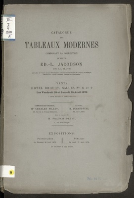 Catalogue des tableaux modernes composant la collection de feu M. Ed.-L. Jacobson de La Haye ... : vente Hotel Drouot les vendredi 28 et samedi 29 avril 1876 / commissaire-priseur Charles Pillet ...