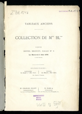Tableaux anciens : collection de Mme Bl*** : vente Hôtel Drouot, Salle No 8, le mercredi 3 mai 1876 / Charles Pillet, commissaire-priseur ; M. Haro, peintre-expert