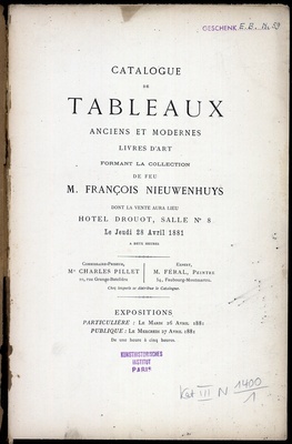 Catalogue de tableaux anciens et modernes, livres d'art formant la collection de feu M. François Nieuwenhuys, dont la vente aura lieu Hotel Drouot le jeudi 28 avril 1881 / commissaire-priseur Charles Pillet ...