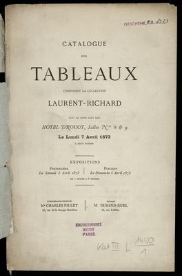 Catalogue des tableaux composant la collection Laurent-Richard dont la vente aura lieu Hotel Drouot le lundi 7 Avril 1873 / commissaire-priseur Charles Pillet ...