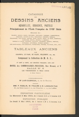 Catalogue des dessins anciens, aquarelles, gouaches, pastels principalement de l'École française du XVIIIe siècle ..., tableaux anciens par Casanova ..., composant la collection de M. A. F... et dont la vente ... aura lieu Hotel des Commissaires-priseurs, Rue Drouot, n° 9 le vendredi 4 mai 1906 / commissaire-priseur Lair-Dubreuil ...