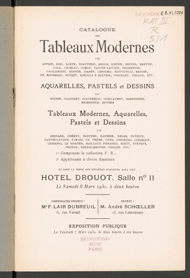 Catalogue des tableaux modernes par Appian, Bail, Barye ..., aquarelles, pastels, dessins par Boudin, Cagniart, Giacomelli ..., tableaux modernes... 1° composant la collection F. R..., 2° appartenant à divers amateurs et dont la vente ... aura lieu Hotel Drouot le samedi 8 mars 1930 / commissaire-priseur F. Lair-Dubreuil ...