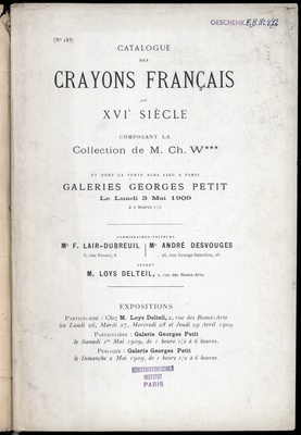 Catalogue des crayons français : du XVIe siècle : composant la Collection de M. Ch. W*** : et dont la vente aura lieu à Paris, Galeries Georges Petit le lundi 3 mai 1909 / commissaires-priseurs F. Lair Dubreuil, André Desvouges ; expert Loys Delteil