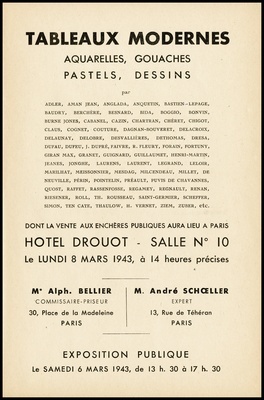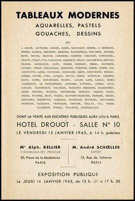 Tableaux modernes : aquarelles, pastels, gouaches, dessins : par: J. Adler, Altmann, Appian, Babin, Bauchant, Beron, A. Bertram [und weitere] : dont la vente aux enchères publiques aura lieu à Paris, Hôtel Drouot, Salle No 10, le vendredi 15 janvier 1943 / Me Alph. Bellier, commissaire-priseur ; André Schœller, expert