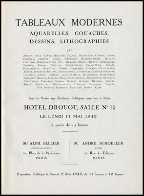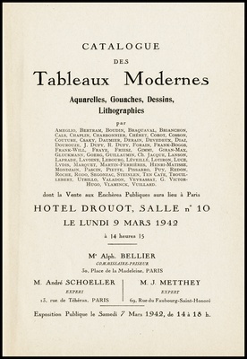 Catalogue des tableaux modernes : aquarelles, gouaches, dessins, lithographies : par Ameglio, Bertram, Boudin, Braquaval, Brianchon [und weitere] : dont la vente aux enchères publiques aura lieu à Paris, Hôtel Drouot, Salle No 10, le lundi 9 mars 1942 / Me Alph. Bellier, commissaire-priseur ; André Schœller, expert, J. Metthey, expert