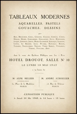 Tableaux modernes : aquarelles, pastels, gouaches, dessins : par: Bail, Brianchon, Ceria, Cézanne, Chaplin, Chirico, Corot [und weitere] : dont la vente aux enchères publiques aura lieu à Paris, Hôtel Drouot, Salle No 10, le lundi 18 mai 1942 / Me Alph. Bellier, commissaire-priseur ; André Schœller, expert