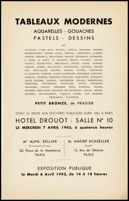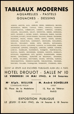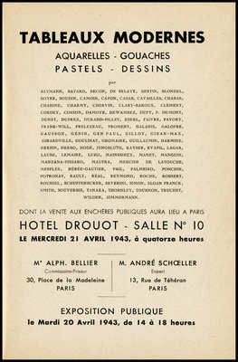Tableaux modernes : aquarelles, gouaches, pastels, dessins : par: Altmann, Batard, Becon, de Belaye, Bertin, Blondel [und weitere] : dont la vente aux enchères publiques aura lieu à Paris, Hôtel Drouot, Salle No 10, le mercredi 21 avril 1943 / Me Alph. Bellier, commissaire-priseur ; André Schœller, expert