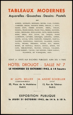 Tableaux modernes : aquarelles, gouaches, dessins, pastels : par: Adrion, Angrand, Bonnard, Boyer, Cals, Camoin [und weitere] : dont la vente aux enchères publiques aura lieu à Paris, Hôtel Drouot, Salle No 7, le vendredi 22 octobre 1943 / Me Alph. Bellier, commissaire-priseur ; André Schœller, expert