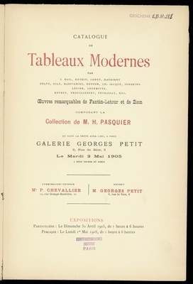 Catalogue de tableaux modernes par J. Bail, Boudin, Corot ..., œuvres remarquables de Fantin-Latour et de Ziem composant la collection de M. H. Pasquier et dont la vente aura lieu, à Paris, Galerie Georges Petit le mardi 2 mai 1905 / commissaire-priseur P. Chevallier ...