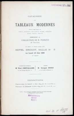 Catalogue de tableaux modernes, œuvres importantes de Corot, Daubigny, Delacroix, Dupré ..., composant la collection de M. Perkins de New York et dont la vente aura lieu Hotel Drouot le lundi 19 juin 1899 / commissaire-priseur Paul Chevallier ...