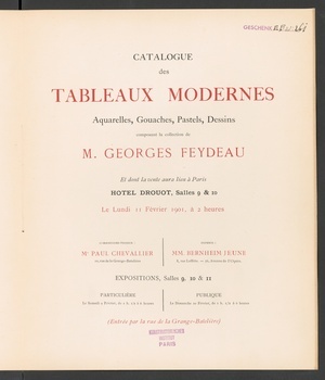 Catalogue des tableaux modernes, aquarelles, gouaches, pastels, dessins composant la collection de M. Georges Feydeau et dont la vente aura lieu à Paris, Hôtel Drouot ... le lundi 11 février 1901 / commissaire-priseur Paul Chevallier ...