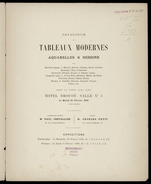Catalogue de tableaux modernes, aquarelles et dessins par Bastien-Lepage, J. Béraud, Bonvin, Chaplin, Corot, Courbet ..., dont la vente aura lieu Hotel Drouot le mardi 25 février 1896 / commissaire-priseur Paul Chevallier ...