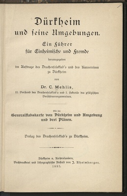 Dürkheim und seine Umgebungen : ein Führer für Einheimische und Fremde / hrsg. im Auftrag des Drachenfelsklub's und des Kurvereines zu Dürkheim von C. Mehlis