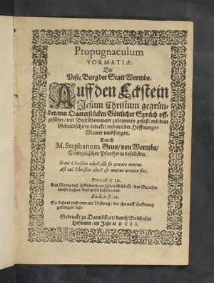 Propugnaculum Vormatiae: Die Veste Burg der Statt Wormbs ; Auff den Eckstein Jesum Christum gegründet/ mit Quaterstücken Göttlicher Sprüch uffgeführt/ mit BußKlammern zusammen gefast/ mit dem Gebettsschirm bedeckt/ und mit der Hoffnungs-Mawer umbfangen / Durch M. Stephanum Grun/ von Wormbs/ Evangelischen Pfarrherrn daselbsten