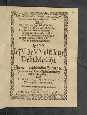 Arma ecclesiolae, suspiria, vota precesque contra hostes & pro pace bona patriae, oder, deß Herrn Jesu Häufflein klein ... : in diesen gefährlichen Zeiten allen Frommen und Gottesfürchtigen zu Lehr und Trost / geprediget durch Hartmannum Braun