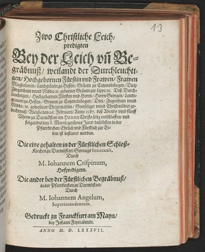 Zwo Christliche Leich=||predigten || Bey der Leich vñ Be=||gräbnuß/ weilandt der Durchleuchti=||gen/ Hochgebornen Fürstin vnd Frawen/ Frawen || Magdalenen/ Landgräuin zu Hessen ... || geborner Gräuin zur Lippe/ [et]c. Deß ... || Herrn Georgen/ Landt=||grauen zu Hessen ... || gewesener Ehegemahlin ... || Welche den 26. Februarij/ Anno 1587 ... || entschlaffen/ vnd || folgendts den 8. Martij/ gerürtes Jars/ daselbsten in der || Pfarrkirchen ... zur Er=||den ist bestattet worden.|| Die eine gehalten in der Fürstlichen Schloß=||Kirchen zu Darmbstatt/ Sontags Inuocauit,|| Durch || M. Iohannem Crispinum,|| Hofpredigern.|| Die ander bey der Fürstlichen Begräbnuß/|| in der Pfarrkirchen zu Darmbstatt/|| Durch || M. Iohannem Angelum,|| Superintendentem.||