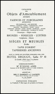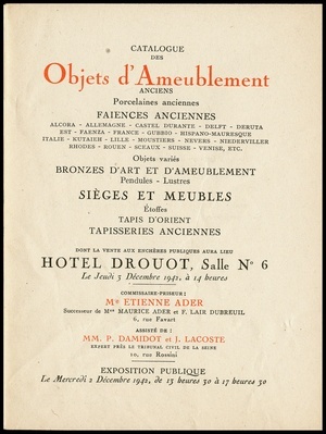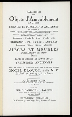 Catalogue des objets d'ameublement anciens : faïences et porcelaines anciennes des fabriques: Asie Mineure, Berlin, Castelli, Chine, Copenhague, Delft [und weiteren] : céramique, objets variés : bronzes, pendules, lustres : sculptures, glaces : sièges et meubles : étoffes : tapis d'Orient : tapisseries anciennes : dont la vente aux enchères publiques aura lieu Hôtel Drouot, Salle No 12 le lundi 4 mai 1942 / commissaire-priseur: Étienne Ader, successeur de Maurice Ader et F. Lair Dubreuil ; assisté de: P. Damidot et J. Lacoste, expert près le Tribunal civil de la Seine