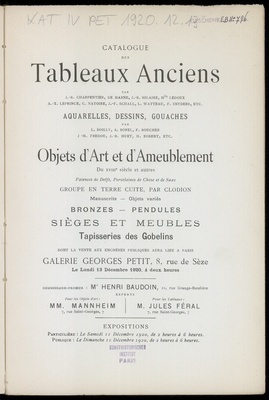 Catalogue des tableaux anciens : par J.-B. Charpentier, de Marne, J.-B. Hilaire, Mlle Ledoux [und weitere] : aquarelles, dessins, gouaches : par L. Boilly, A. Borel, F. Boucher [und weitere] : objets d'art et d'ameublement du XVIIIe siècle et autres : faïences de Delft, porcelaines de Chine et de Saxe : groupe en terre cuite par Clodion : manuscrits, objets variés : bronzes, pendules, sièges et meubles : tapisseries des gobelins : dont la vente aux enchères publiques aura lieu à Paris, Galerie Georges Petit, 8, rue de Sèze, le lundi 13 décembre 1920 / commissaire-priseur Henri Baudoin ; experts pour les objets d'art: M. Mannheim, pour les tableaux Jules Féral