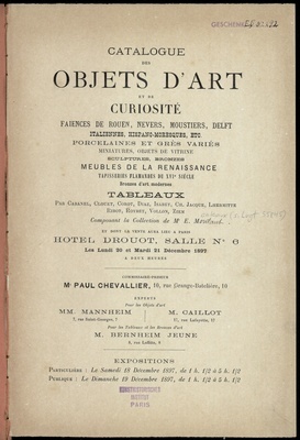 Catalogue des objets d'art et de curiosité, fai͏̈ences de Rouen, Nevers, Moustiers, Delft ..., porcelaines et grès variés ..., meubles de la renaissance ..., tableaux ..., composant la collection de Mr E. M. [i.e. Emile Monteaux] et dont la vente aura lieu à Paris, Hotel Drouot, les lundi 20 et mardi 21 décembre 1897 / commissaire-priseur Paul Chevallier ...